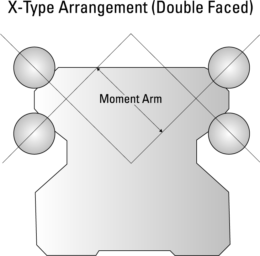 All else being equal, double-backed profile rails have a higher resistance to moment loads. This is because the O-type arrangement of vectors resisting the moment load is further from the center of rotation (Figure 2), giving them extremely high rigidity and accuracy. The O-type arrangement, however, cannot tolerate misalignment or surface imperfection. Inadequate surface preparation will make the guide run rough and subject it to more frequent replacement. Even tiny flatness errors can cut reduced bearing life in half, and more severe alignment issues can result in immediate failure. These potential flaws result in a higher cost of installation, which can be several times the cost of a double-faced bearing track architecture. Typical mounting surface requirements require 15-20 times more precision than the double-faced counterparts.